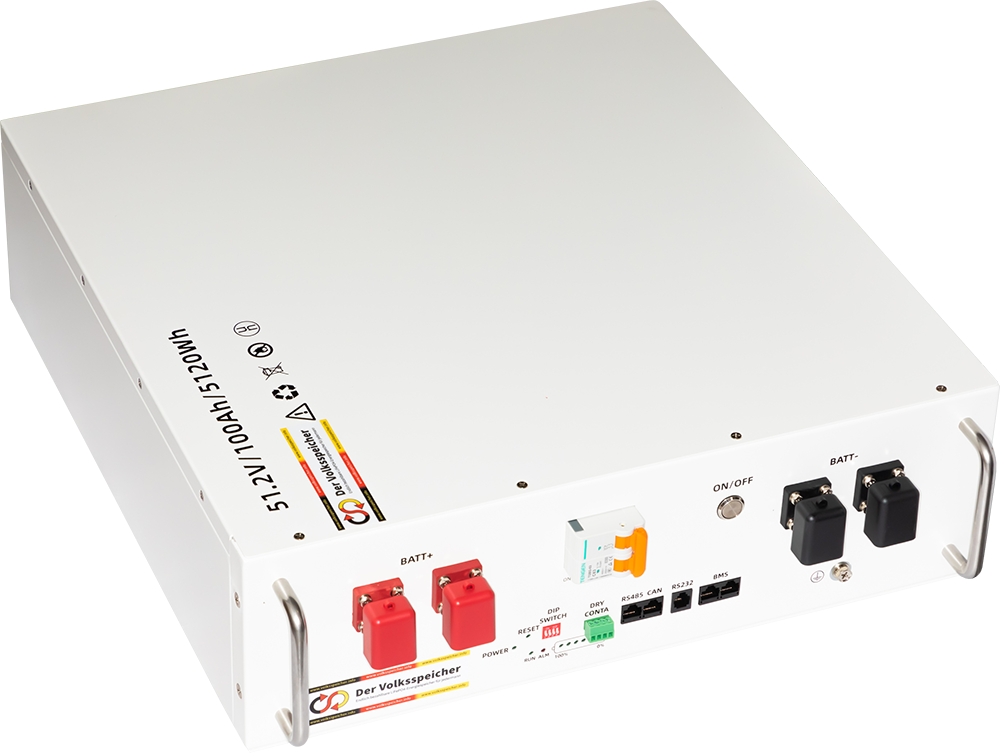 - 51,2 Volt Spannung, 100 Ah Kapazität, 5,12 kWh Energie