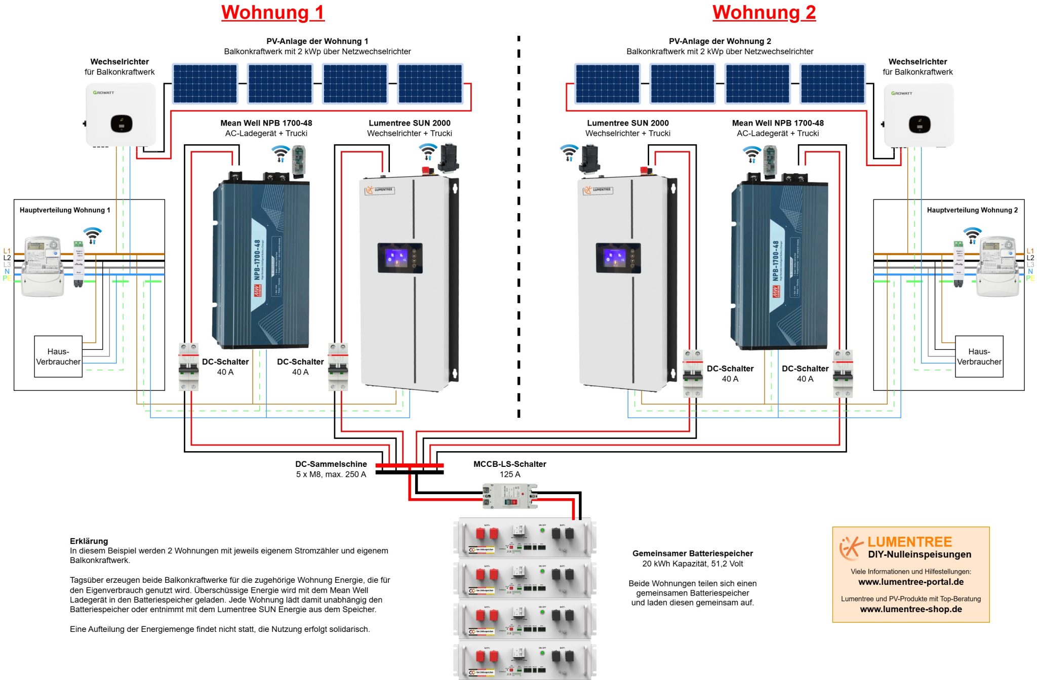 Jedes Balkonkraftwerk versorgt die jeweils eigene Wohnung tagsüber mit Energie. Die überschüssige PV-Energie wird dann mit einem Mean Well Ladegerät mit Trucki in einen gemeinsamen Batteriespeicher geladen. Als Wechselrichterr kommt jeweils ein Lumentree SUN 2000 mit Trucki zum Einsatz und versorgt die jeweilige Wohnung mit Energie aus dem gemeinsamen Batteriespeicher.