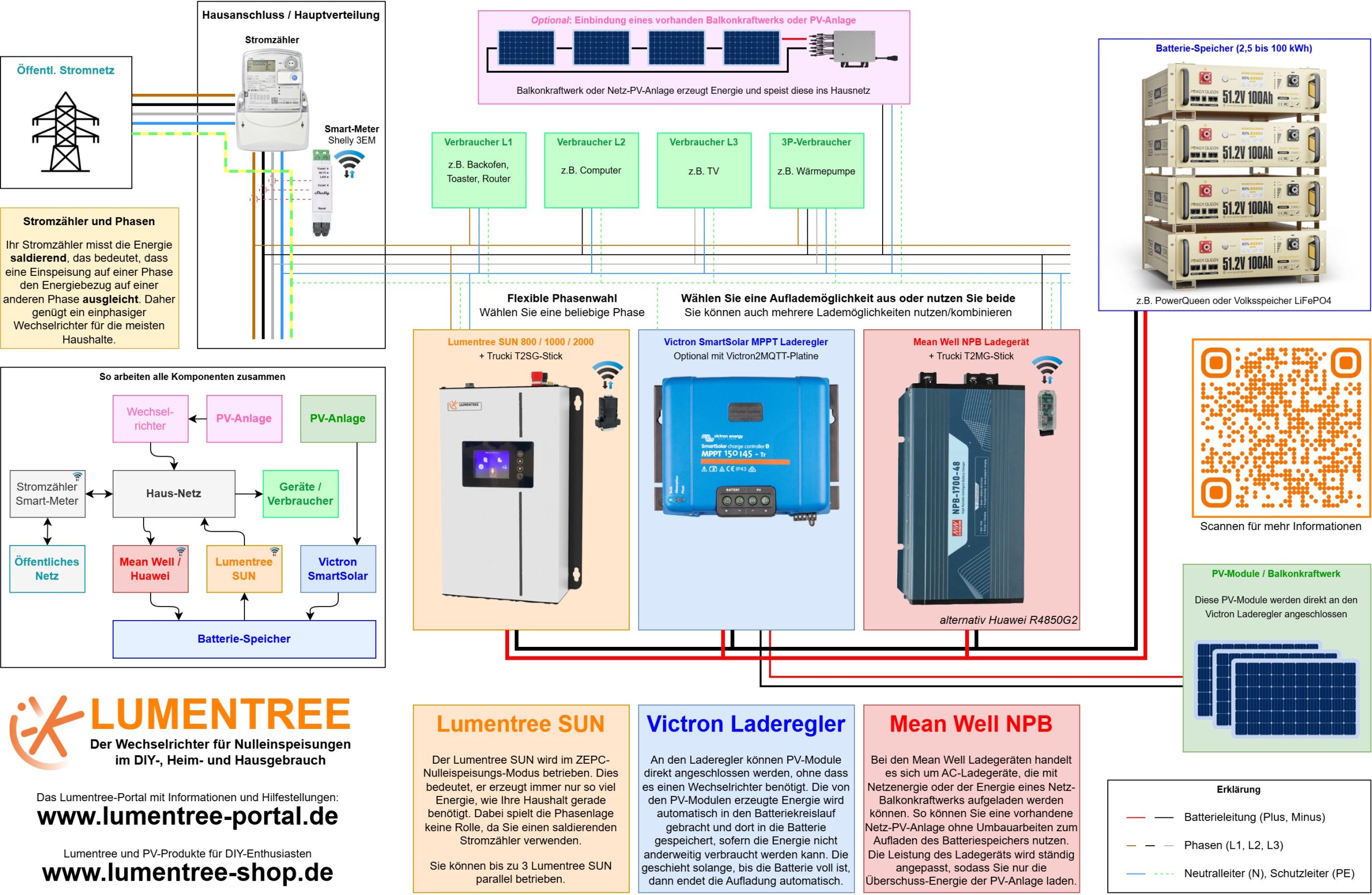 Sowohl der Lumentree SUN als auch die Huawei- und Mean-Well-Ladegeräte arbeiten mit einem Trucki-Stick/Platine. Dadurch stimmen alle Geräte Ihre Leistung untereinander ab und laden entweder den Speicher auf oder erzeugen Energie.