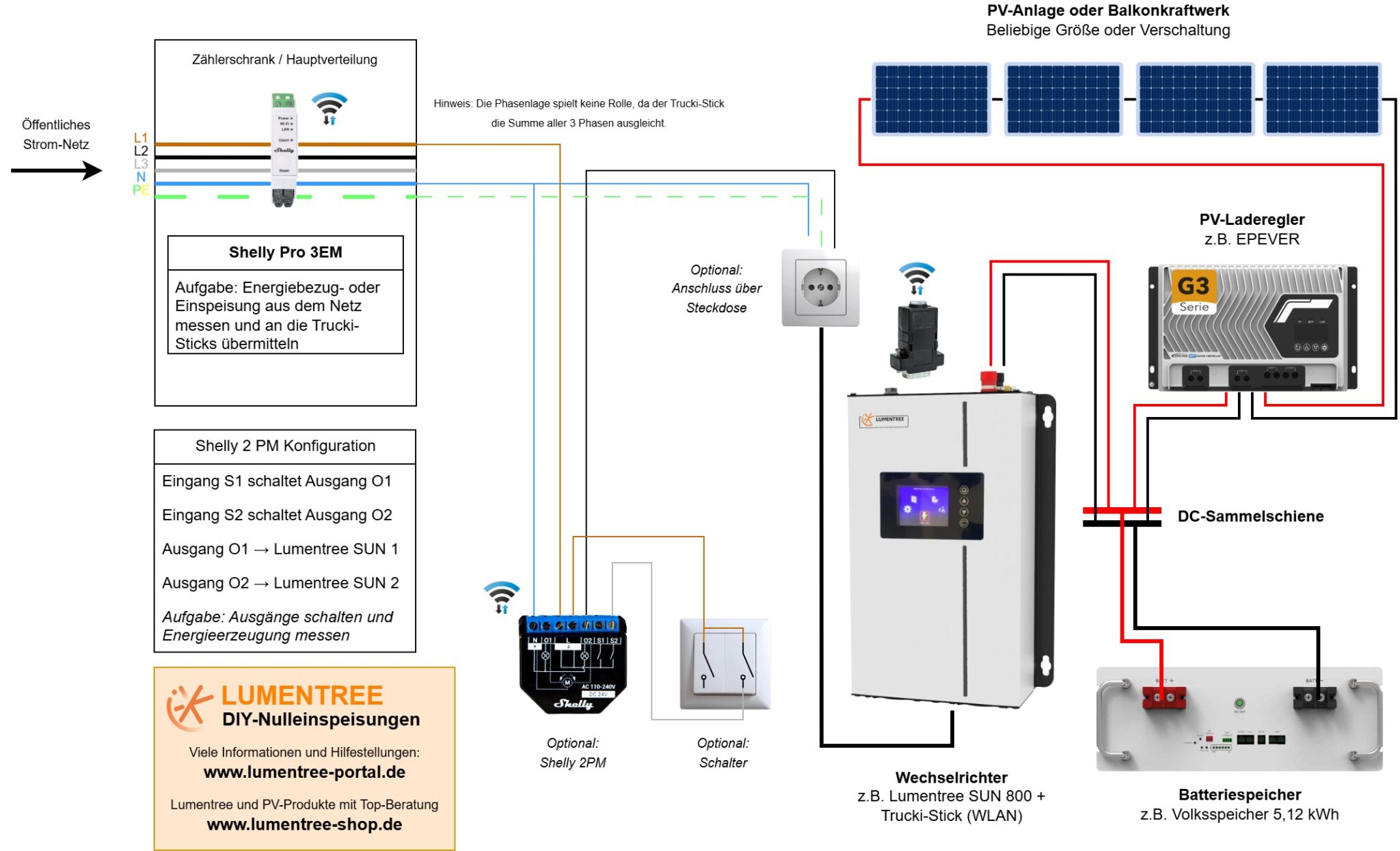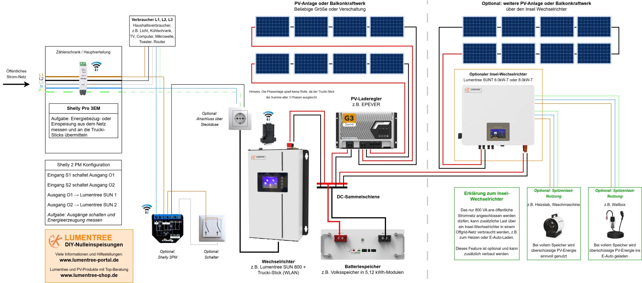 - Optional: Zusätzlicher Inselwechselrichter zum Laden des Elektro-Autos oder Verbrauchen von Spitzenlast (z.B. Lumentree SUNT 6.0 kW-T)
