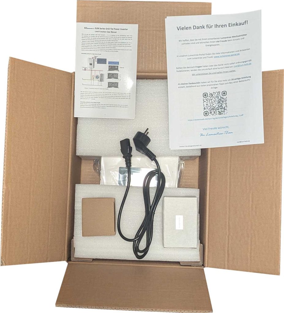 Der Lumentree SUN wird sicher verpackt in einem doppelwandigen Karton mit sehr dicker Schaumstoff-Verpackung geliefert. Mit dabei ist eine deutschsprachige Anleitung, eine Schnellstart-Anleitung sowie Zubehör.